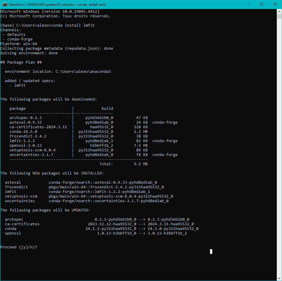 To install any new package, run the anaconda prompt (see above). Then run the following command (example here to install lmfit) :